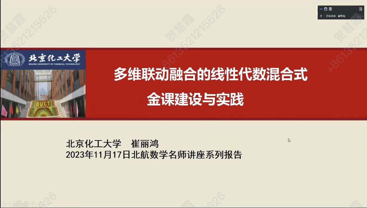 20231117日,北京市教学名师、北京化工大学崔丽鸿教授,应邀为到我院做了“多维联动融合的线性代数混合式金课建设与实践”的学术报告。