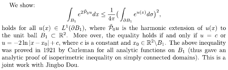 报告人简介: 朱梅俊,美国Oklahoma大学数学系终身教授,中国科学技术大学访问教授。研究领域为偏微分方程及其在整体几何和图像处理中的应用。近些年研究兴趣集中在非线性方程正解的分类及其爆破分析、最佳几何不等式、曲线流、图像处理中的数学理论等。在Duke Math. J.、CPAM、GAFA、Adv. Math.、IMRN、JFA等著名国际数学期刊发表学术论文30余篇。2001年获美国数学会Centennial Fellowship奖。
