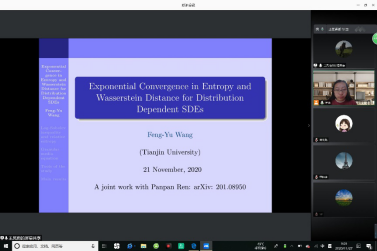 11月27日上午,国家杰出基金获得者、长江特聘教授王凤雨教授受邀为数学科学学院师生带来了一场题为:“Exponential Convergence in Entropy and Wasserstein Distance for Distribution Dependent SDEs ”的学术报告。本报告介绍了分布相关随机微分方程熵和Wasserstein距离的指数收敛性。
